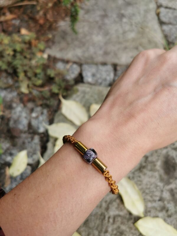Całość zapleciona na wytrzymałym sznurku w kolorze ciemnego złota.