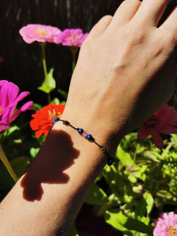 Całość zapleciona na wytrzymałym sznurku w kolorze czarnym.
