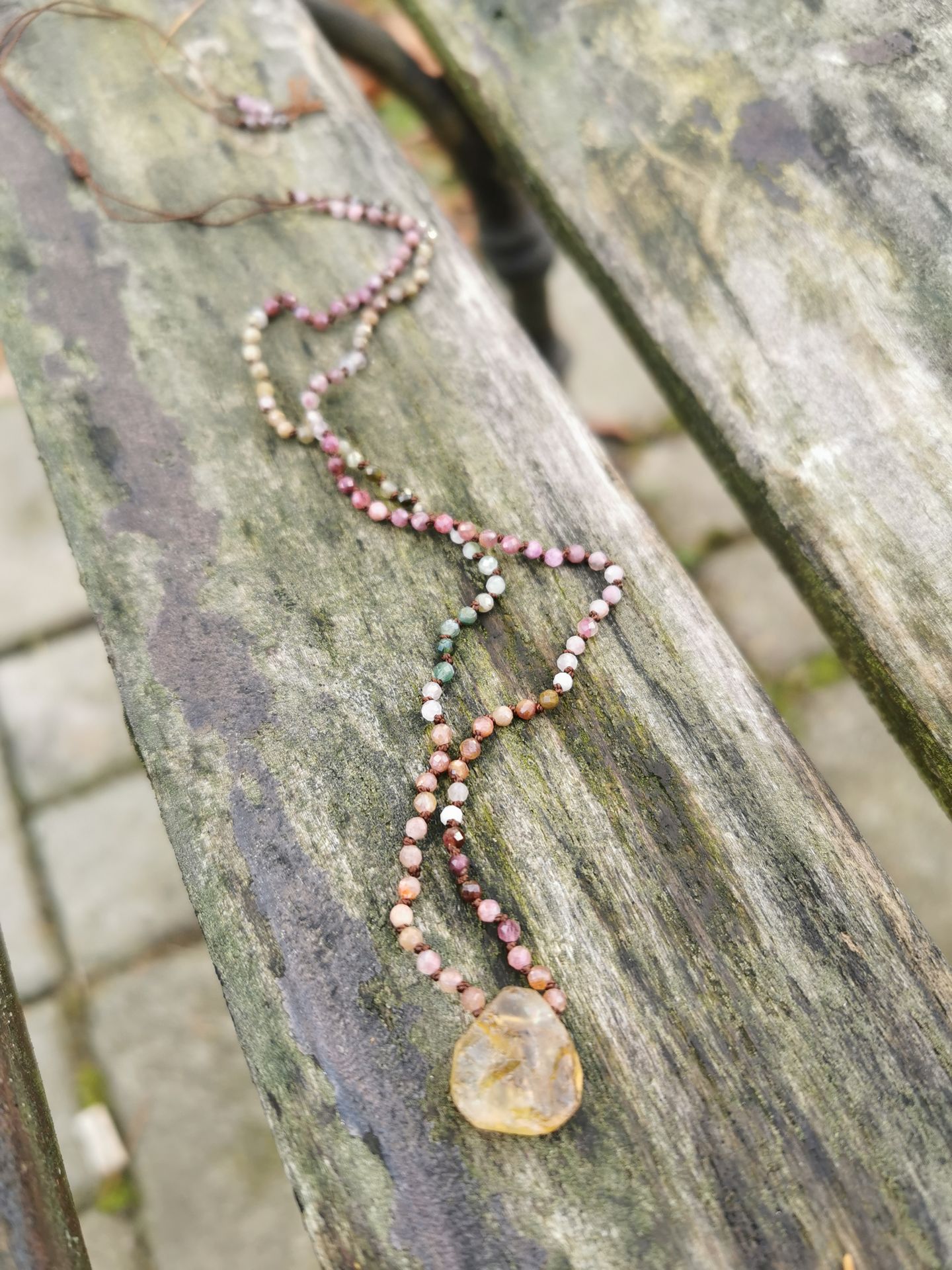 Naszyjnik z naturalnymi minerałami – surową bryłką cytrynu oraz turmalinem cieniowanym.