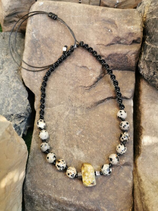Naszyjnik z naturalnymi minerałami – surową bryłką granatu zielonego oraz jaspisem dalmatyńczykiem i hematytem.