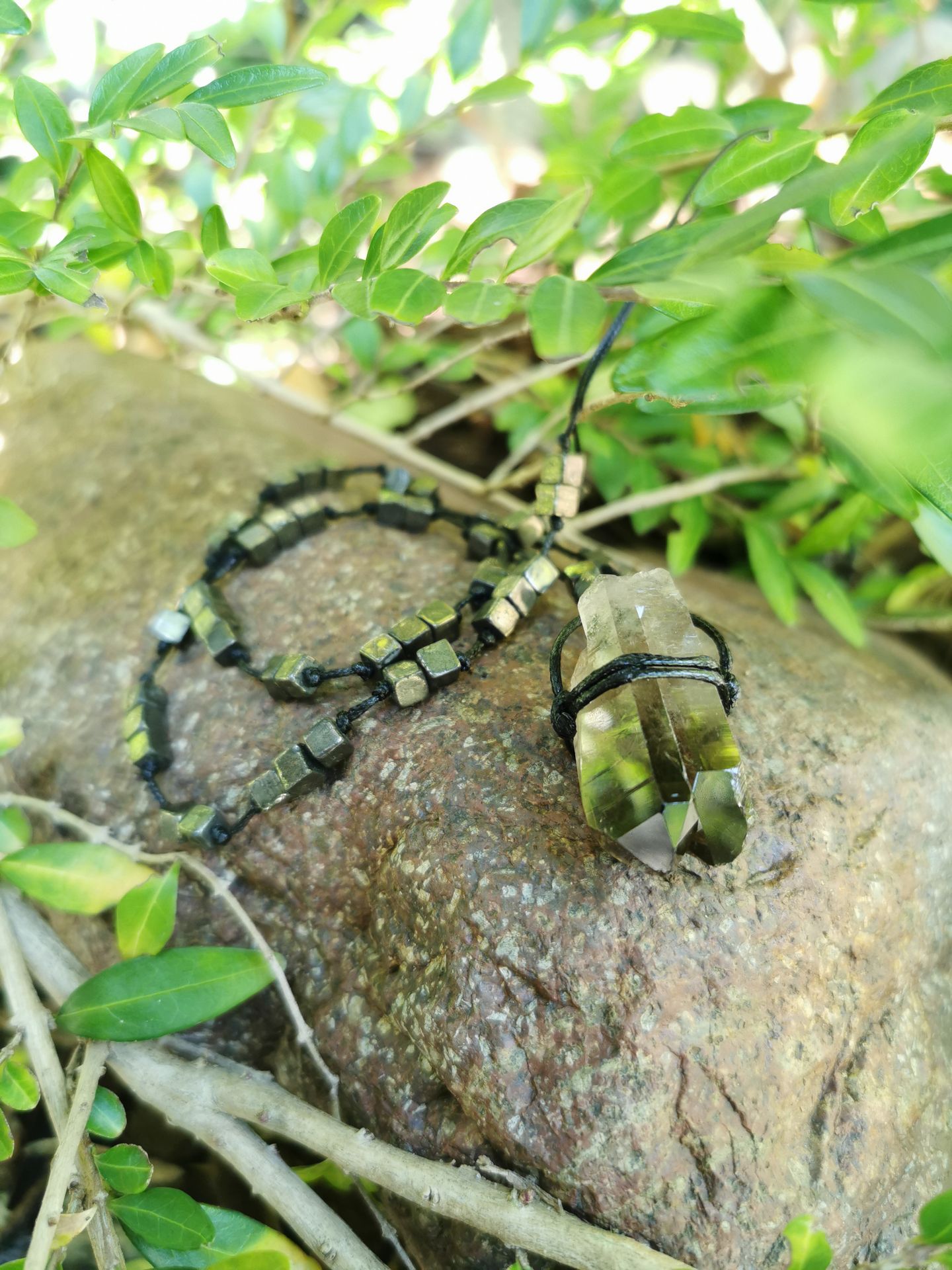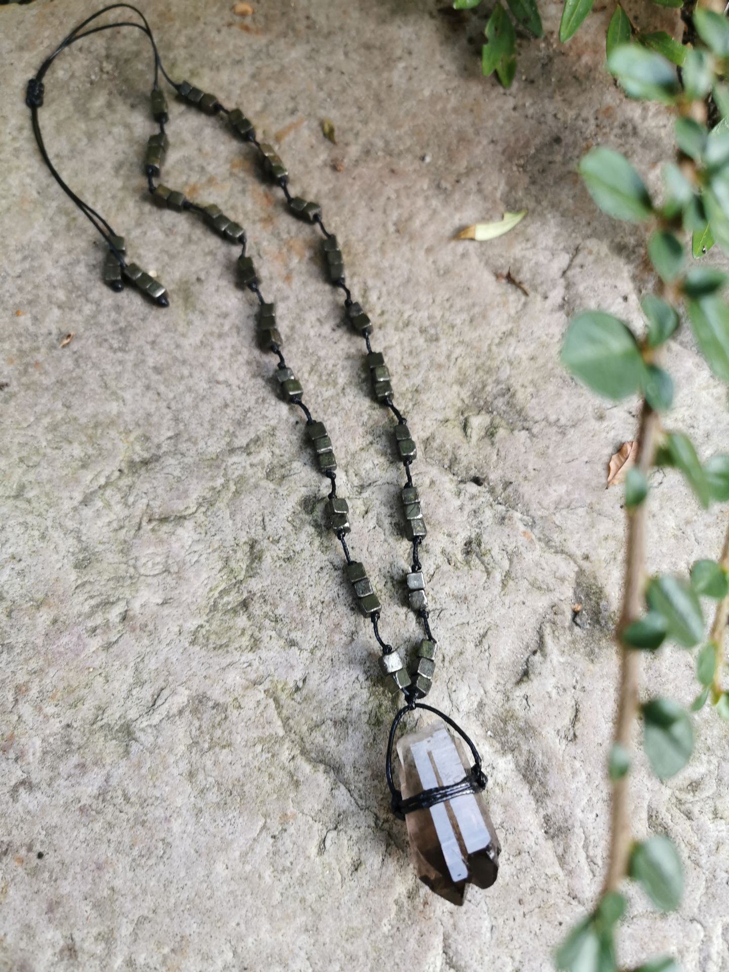 Naszyjnik z naturalnymi minerałami – surowym kwarcem dymnym i kostkami pirytu.